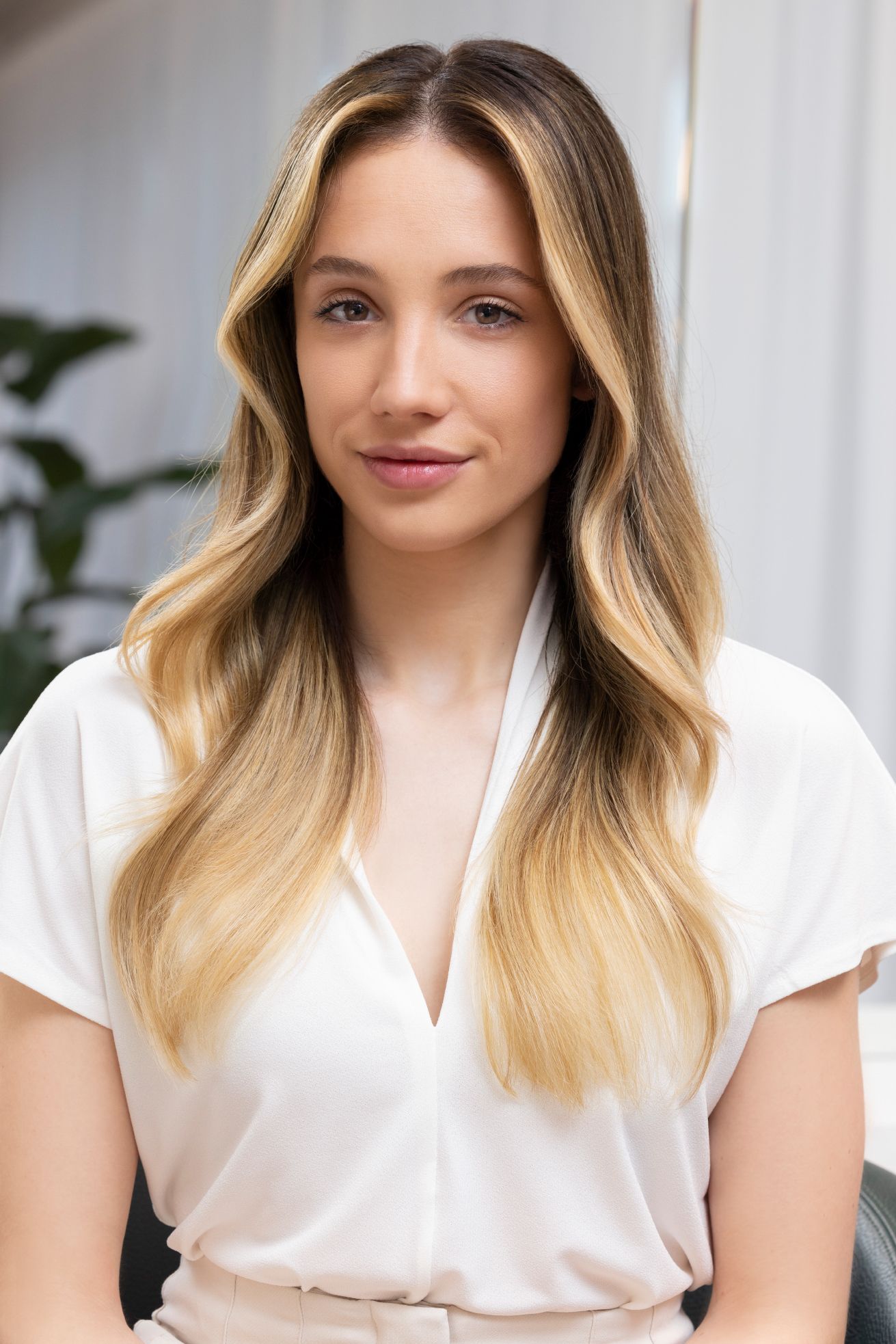Auffrischung der vorhandenen Balayage durch Face-Framing, Glossing, Root-Shadow, Treatment, Cut & Blowout.